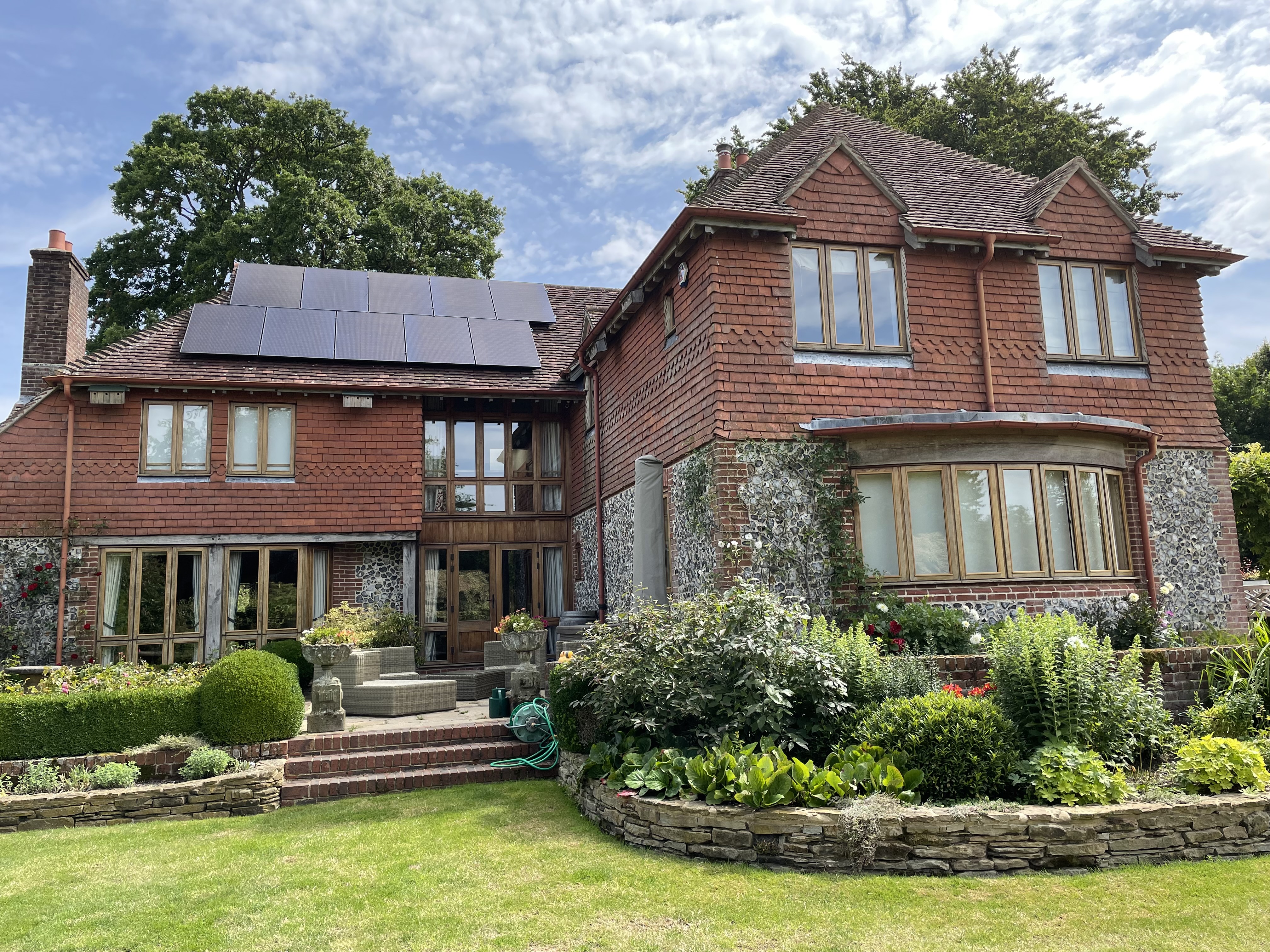 These generate approximately 15KwP and are complimented by 38Kwh of battery storage. Around 10Kwh of this is reserved as a back-up in a power cut.
